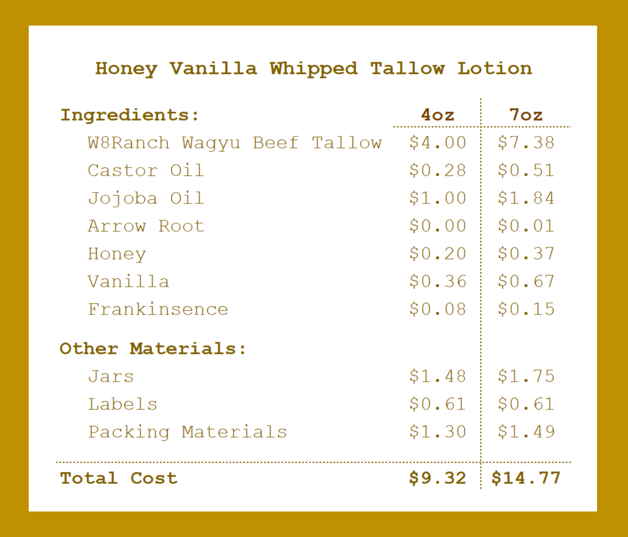 Please note: Our transparent pricing reflects only the cost of materials, including ingredients and packaging. It does not include the cost of labor. Each product is carefully handcrafted in small batches, but we intentionally leave labor costs out of the pricing breakdown to keep things simple and to highlight the true cost of clean, high-quality ingredients.