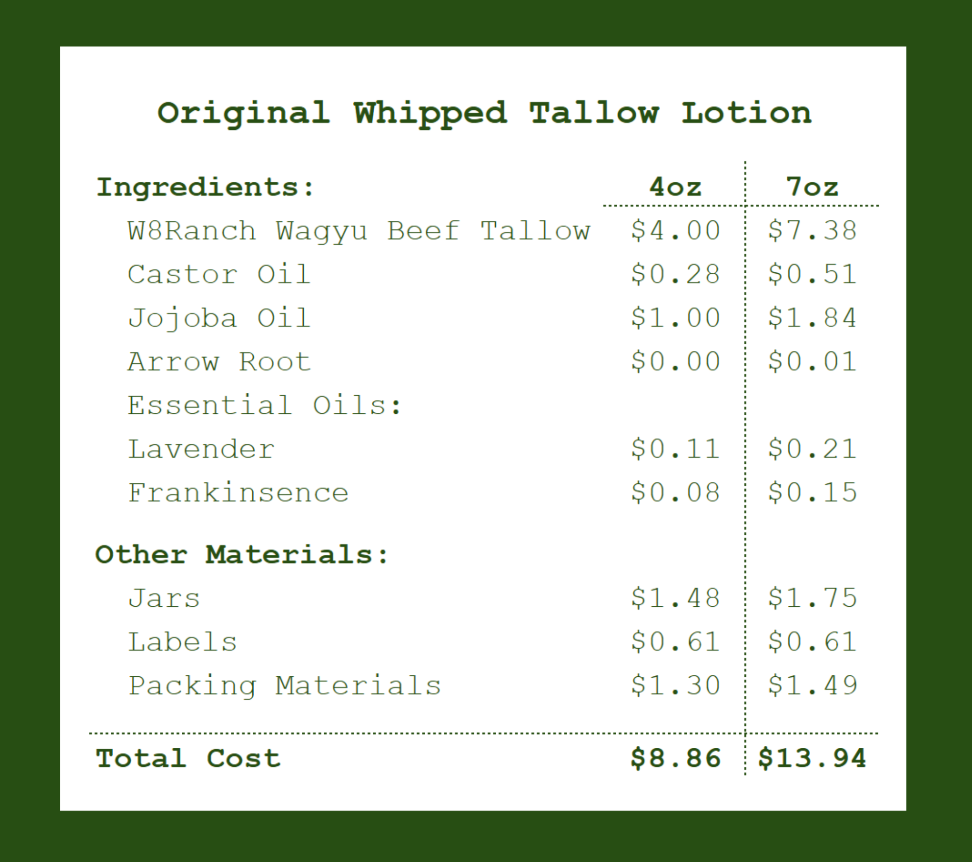 Please note: Our transparent pricing reflects only the cost of materials, including ingredients and packaging. It does not include the cost of labor. Each product is carefully handcrafted in small batches, but we intentionally leave labor costs out of the pricing breakdown to keep things simple and to highlight the true cost of clean, high-quality ingredients.